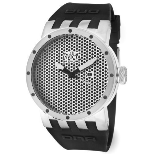 Stainless steel case with a black silicone rubber strap. Fixed stainless steel bezel. Black and silver honeycone dial with luminous black hands. Dial Type: Analog. Luminescent hands. Date display at the 3 o'clock position. Quartz movement. Scratch resistant flame fusion crystal. Pull / push crown. SInvicta Men's 10416 DNA Mesh Silver Sandblast and Black Dial Watch Do not Miss!! Stainless steel case with a black silicone rubber strap. Fixed stainless steel bezel. Black and silver honeycone dial with luminous black hands. Dial Type: Analog. Luminescent hands. Date display at the 3 o'clock position. Quartz movement. Scratch resistant flame fusion crystal. Pull / push crown. S... Invicta Men's 10416 DNA Mesh Silver Sandblast and Black Dial Watch