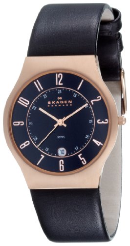 Genuine style. This men's watch has genuine black leather straps that connect to a ion plated rose gold stainless steel case. The shiny black dial features 12 rose gold luminous numbered indicators, a 24-hour dial and date function above the six hour. Japanese-Quartz movement; Genuine black leather Skagen Men's 233XXLRLB Denmark Classic Rose Gold Case Watch Do not Miss!! Genuine style. This men's watch has genuine black leather straps that connect to a ion plated rose gold stainless steel case. The shiny black dial features 12 rose gold luminous numbered indicators, a 24-hour dial and date function above the six hour. Japanese-Quartz movement; Genuine black leather ... Skagen Men's 233XXLRLB Denmark Classic Rose Gold Case Watch