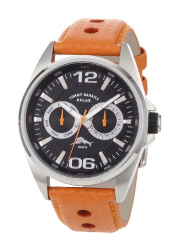 Casual watch, Japanese quartz movement, Multifunction featuring day and date subdials, Polished silver-tone sword hands with luminous accents and orange sweep seconds, Polished orange hands mark subdials, Applied luminescent polished silver-tone Arabic numbers mark twelve and six o'clock, Applied poTommy Bahama Relax Men's RLX1110 Sport Analog Black Dial Water Resistant Watch Do not Miss!! Casual watch, Japanese quartz movement, Multifunction featuring day and date subdials, Polished silver-tone sword hands with luminous accents and orange sweep seconds, Polished orange hands mark subdials, Applied luminescent polished silver-tone Arabic numbers mark twelve and six o'clock, Applied po... Tommy Bahama Relax Men's RLX1110 Sport Analog Black Dial Water Resistant Watch